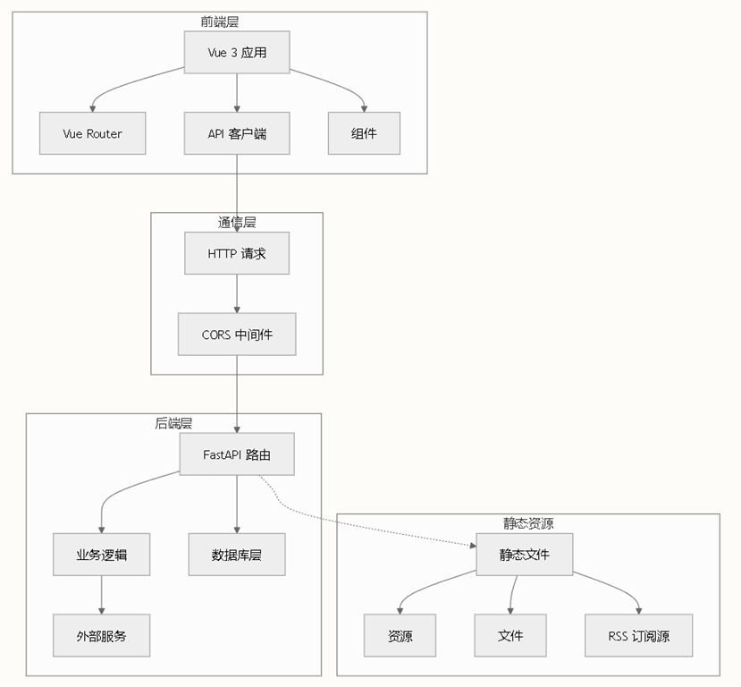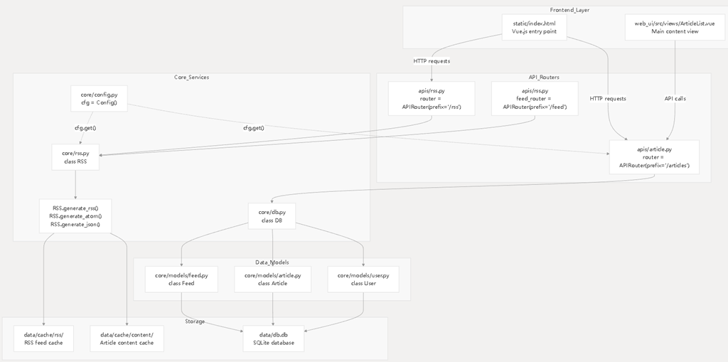 基于 FastAPI 的后端通过路由(如 /rss/{feed_id})对外提供服务,用户的 RSS 阅读器通过这些 URL 即可获取更新。