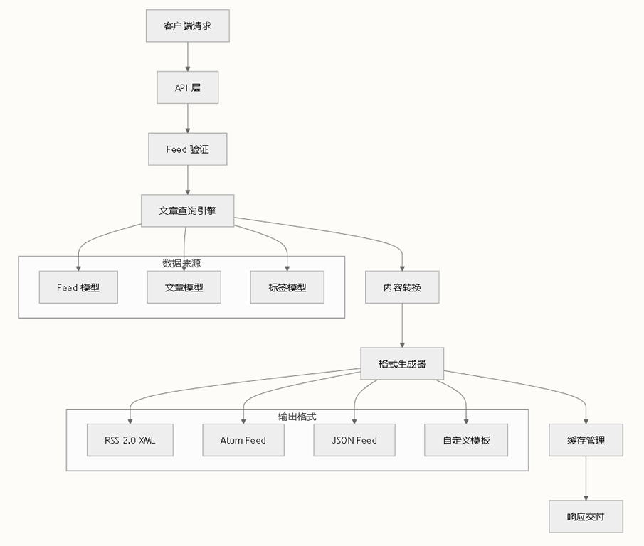 这种双层设计使系统能够快速提供预生成的 RSS feeds,同时维护缓存的文章内容以支持快速重建和内容处理。