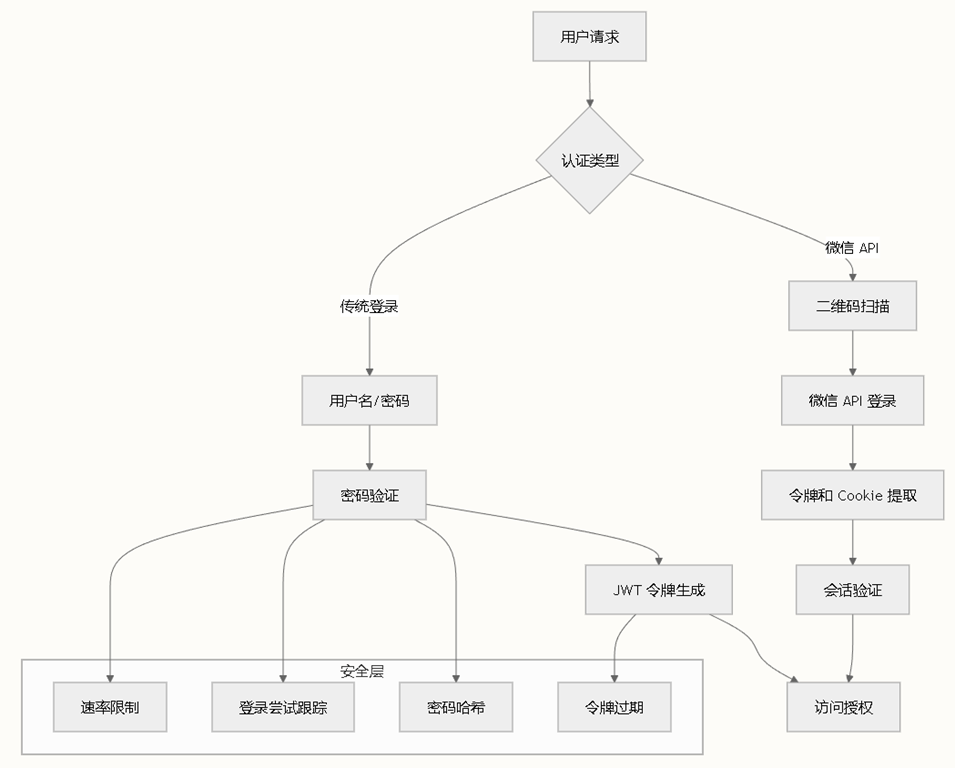 证系统通过两个主要机制运行:使用 JWT 令牌的传统用户名/密码认证,以及使用二维码扫描的微信公众号 API 认证。这种双重方法确保了人工用户访问和自动化内容收集能力。