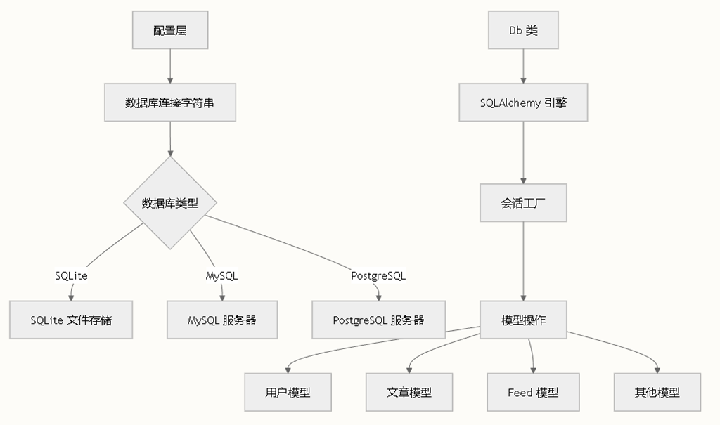 we-mp-rss 系统采用 SQLAlchemy ORM系统采用集中式数据库管理方法,通过 core/db.py 中的 Db 类实现,该类抽象了数据库操作,无论底层使用何种数据库引擎,都能提供统一接口。