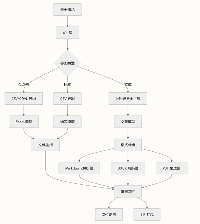 导出系统围绕三个主要组件构建:用于基于 Web 导出的 API 端点、用于文章导出的批处理工具以及格式转换工具。架构采用模块化设计,每种导出类型都有专门的处理器,同时共享文件管理和数据处理的通用基础设施。