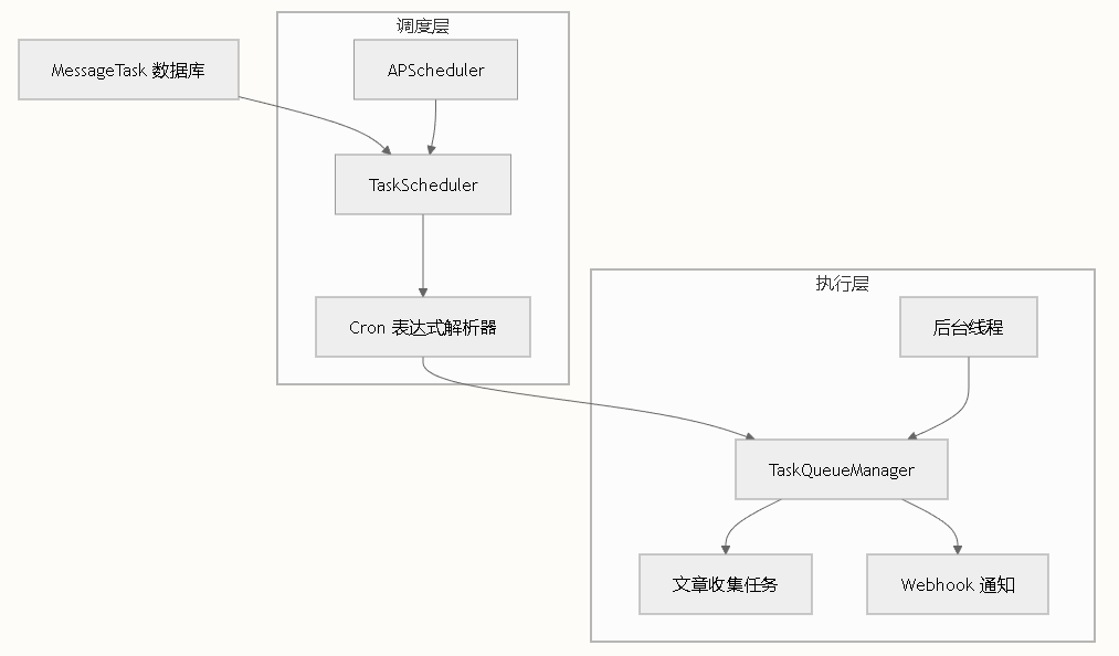 微信 MP RSS 系统实现了一套复杂的定时任务管理架构,结合了基于 cron 的调度与基于队列的执行,以确保可靠的文章收集和通知投递。该系统设计用于处理多个并发任务,同时保持鲁棒性和灵活性。任务管理系统围绕两个主要组件构建:用于基于 cron 调度的 TaskScheduler 和用于顺序任务执行的 TaskQueueManager。这种双层方法既确保了时间精度,又实现了受控的资源利用。