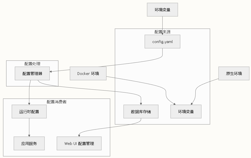 配置系统采用分层方法,使用基于 YAML 的配置文件、环境变量替换和运行时配置管理。系统支持基于文件和数据库驱动的配置存储。