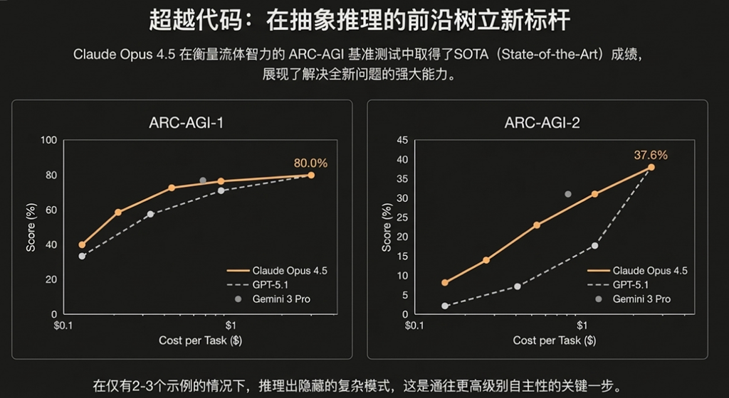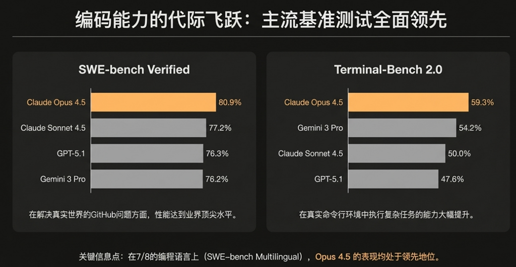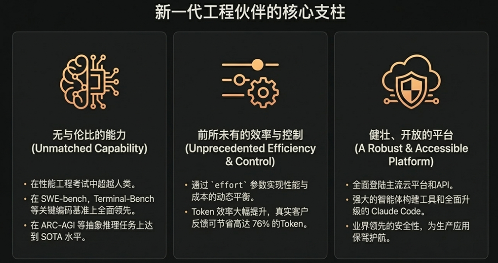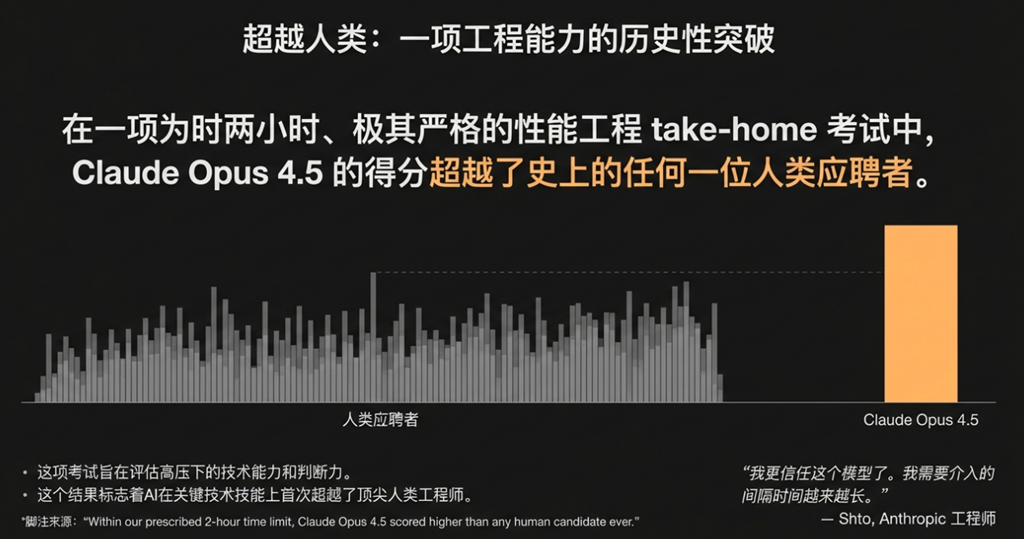 一个令人震撼的事实是:在一项时长2小时、极其困难的内部工程带回测试中,Opus 4.5 的得分“超过了任何人类候选人”¹。这标志着 AI 在专业工程领域达到了前所未有的高度。其卓越能力主要体现在以下三个方面: