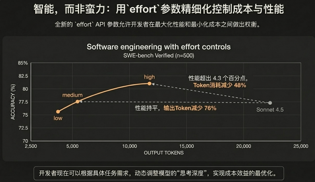 这个参数是革命性的:它允许开发者以接近上一代模型的成本获取 Opus 级别的智能,或者解锁前所未有的性能,而消耗的资源依然显著减少。这不再是速度与力量的简单取舍,而是在每个层级都开创了效率的新前沿。