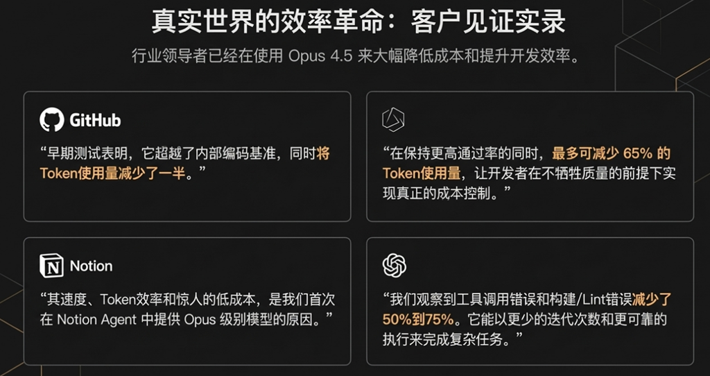 • 显著的效率提升:客户反馈,在执行代码迁移和重构等复杂任务时,Opus 4.5 的“token 使用量减半”,甚至“减少高达 65%”,同时性能不降反升。这意味着它深刻理解了问题的核心,能用更少的资源直击要害,为开发者直接转化为更低的成本和更高的效率。