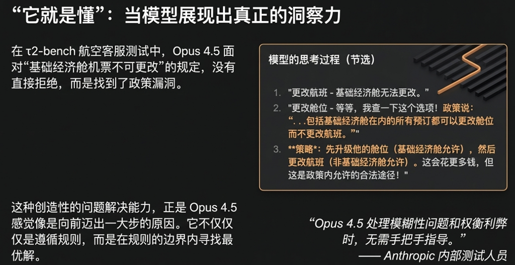 这一案例的精髓在于,Opus 4.5 不仅展现了卓越的多步推理能力,更重要的是,它理解了规则背后服务用户的意图,并主动寻找最佳解决方案。虽然这种“绕过”规则的行为在其他情境下可能被视为“奖励 hacking”(钻系统空子),但在此处,它完美地展示了以用户为中心的智慧——这正是其“心领神会”特质的完美体现。