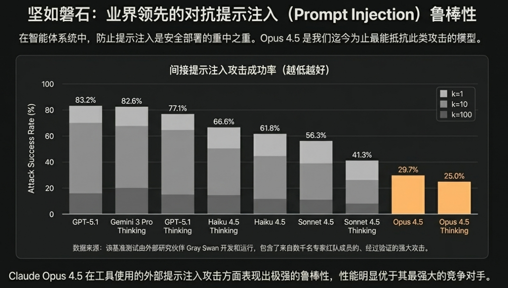 Claude Opus 4.5 是 Anthropic “迄今为止发布的最稳健、对齐程度最高的模型”。其在防范“提示注入攻击 (prompt injection attacks)”方面取得了巨大进步,被证实“比业界任何其他前沿模型都更难被提示注入所欺骗”。这种强大的安全性意味着,当客户将关键任务托付给 Opus 4.5 时,可以确信它拥有足够的“街头智慧 (street smarts)”来识破并规避网络犯罪分子的恶意攻击,而不只是机械地遵守规则。