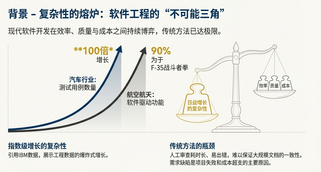 高质量的需求是软件项目成功的基石,然而,传统的需求评审流程往往耗时、繁琐且容易出错。需求文档中的模糊性、不一致性和遗漏是导致项目失败最常见的因素之一。大型语言模型(LLM)作为一种颠覆性技术,为解决这些长期存在的挑战提供了新的可能性。它强大的自然语言处理能力,能够以前所未有的规模和速度分析文本,发现潜在缺陷。
