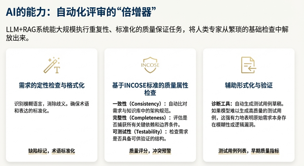 • AI的视角:技术层面的正确性 AI擅长检查需求的结构是否完整、语法是否无误、是否存在明显的逻辑冲突。它能确保一份需求“写得对”。