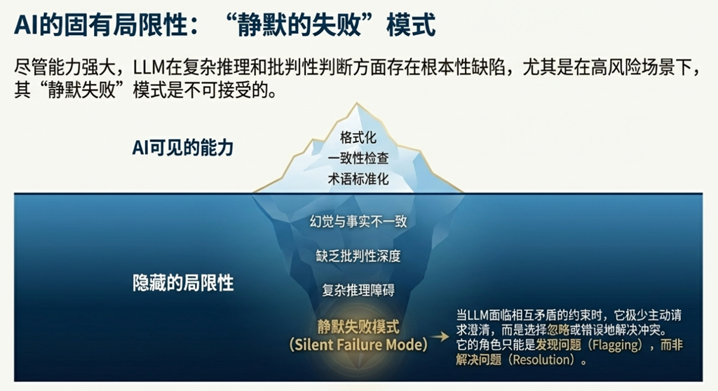• 案例分析 2 (医学领域):研究发现,LLM在评估医学研究论文时表现不佳,因为它难以理解统计数据背后的细微差别和临床实践中充满谨慎的专业措辞。这与复杂的软件需求非常相似——这些需求同样充满了需要深厚领域知识才能准确解读的隐性上下文和行业惯例,而这正是LLM所缺乏的。