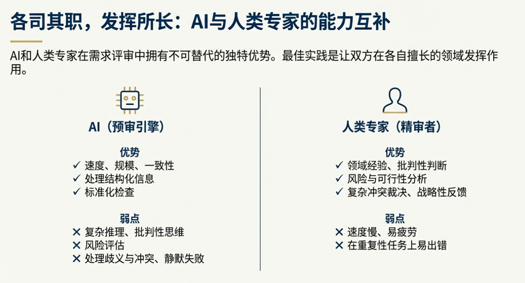 AI和人类专家在评审需求时,关注的焦点存在本质差异。这种差异决定了两者在评审流程中扮演着互补而非替代的角色。
