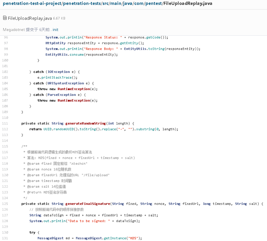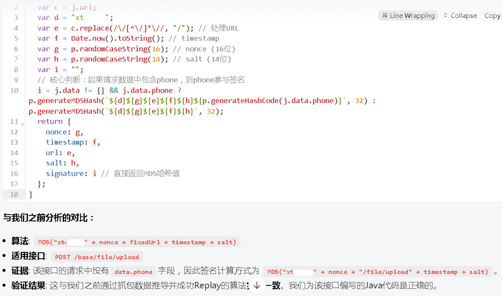 LLM 分析结果: 模型精准识别出签名算法为 MD5 哈希,并指出了关键的拼接顺序: $$MD5("xt..." + nonce + fixedUrl + timestamp + salt)$$