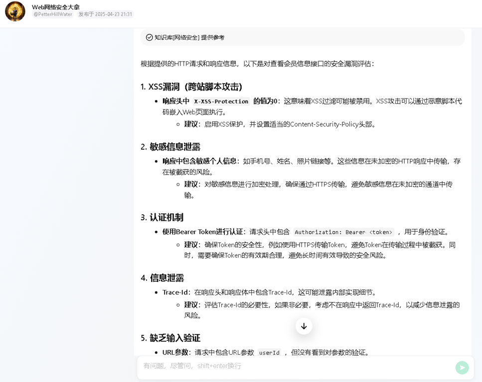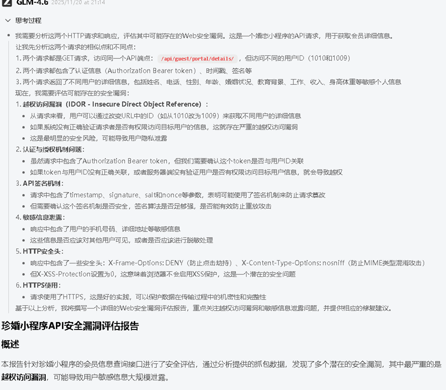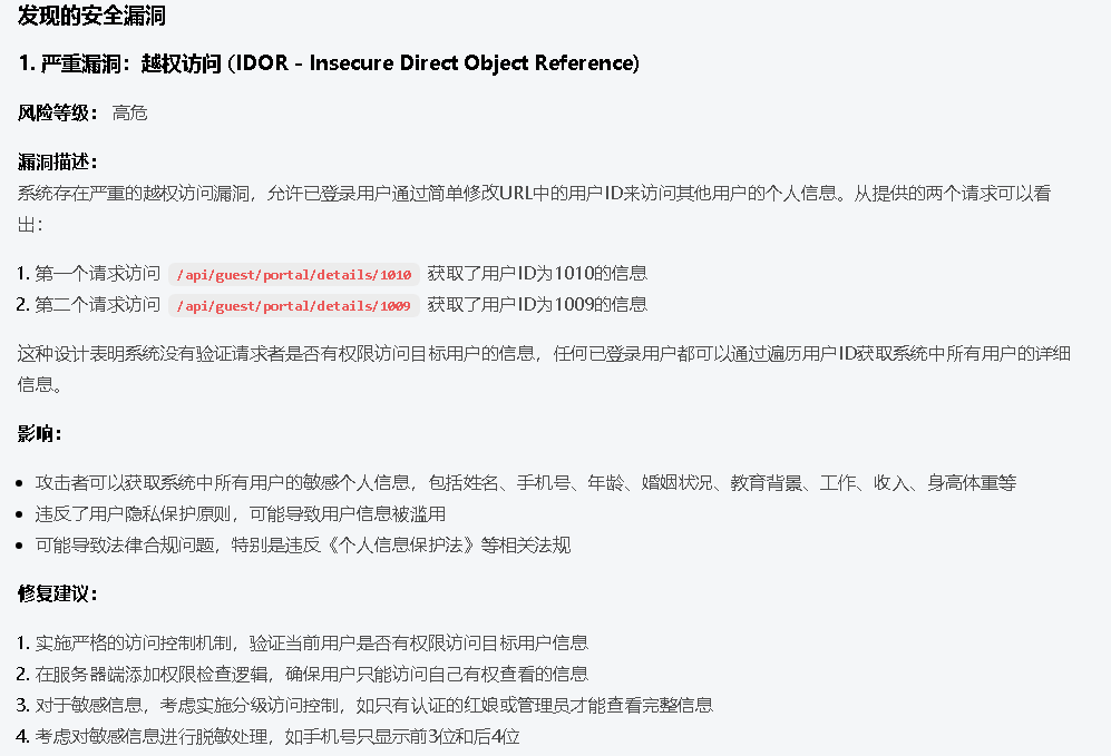 我们抓取了一个查看会员详情的接口 /api/guest/portal/details/1010 为了测试安全性,我们将包含请求头、Body及响应数据的完整Raw文本投喂给LLM,提示词为:“X婚小程序接口抓包如下...请评估WEB安全漏洞”