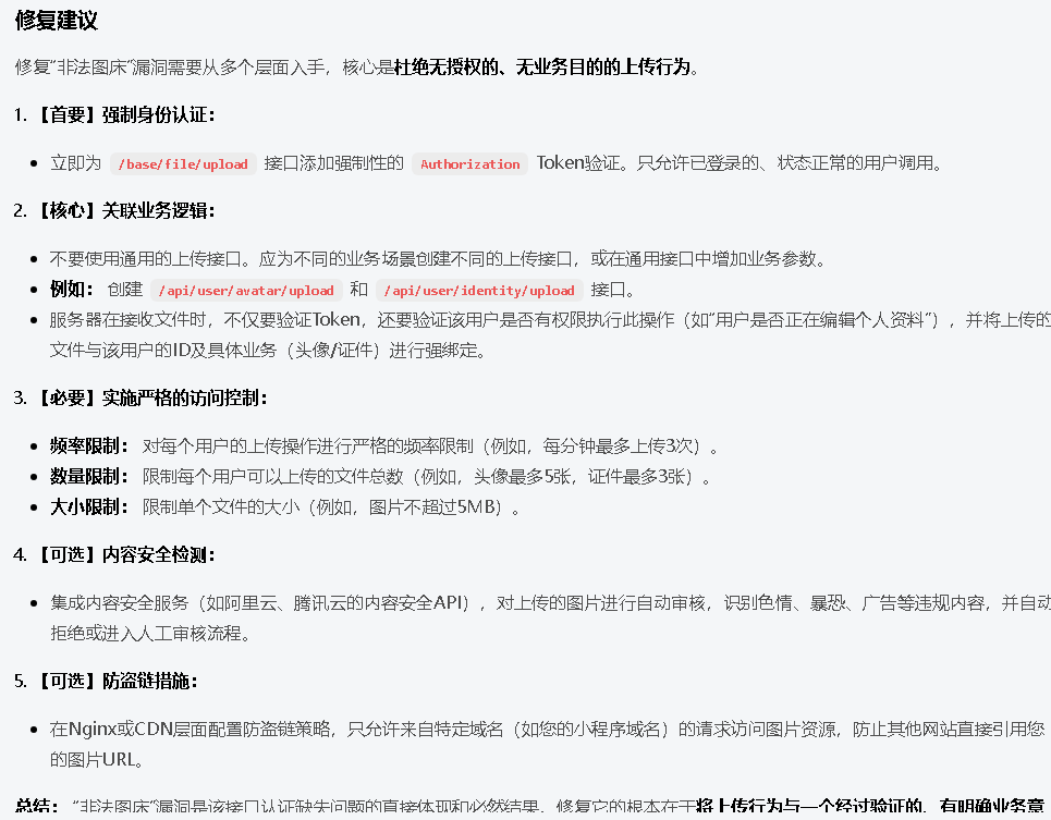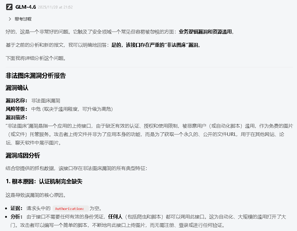 Authorization字段为空。这意味着接口没有任何身份验证,“任何知道该接口URL的攻击者都可以直接调用此接口” - 非法图床漏洞(中/高危): AI 进一步指出,由于服务器返回了公开的图片URL, 且缺乏业务逻辑绑定,该接口极易被黑产利用作为“免费图床”。