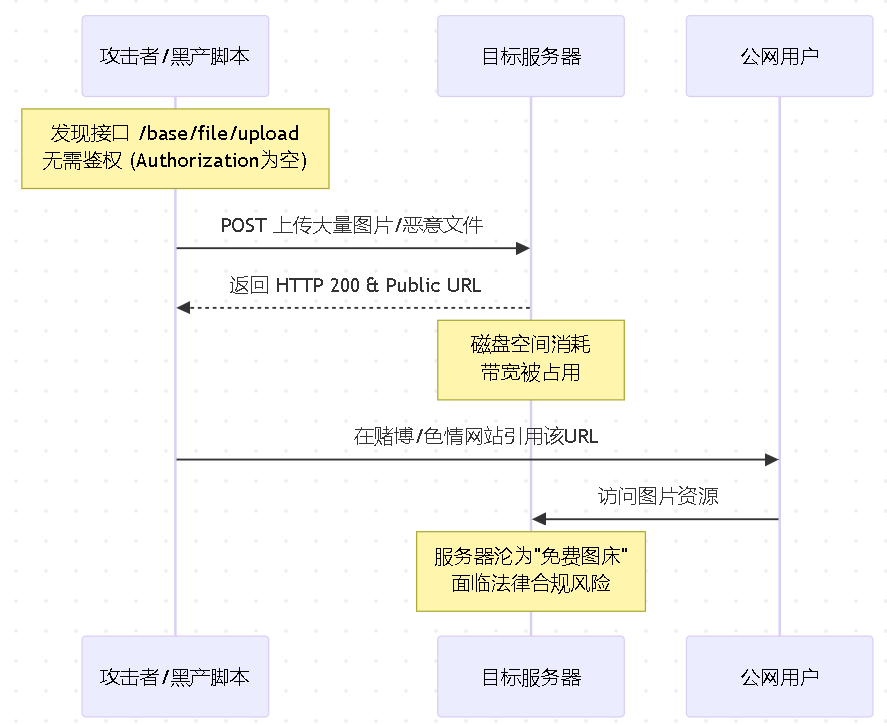 非法图床 | /base/file/upload | 中/高危 | 缺乏频率限制、文件类型白名单及业务绑定 | 域名被封禁、法律风险、DDoS |