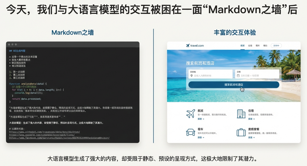 在当前的技术浪潮中,大语言模型(LLM)已展现出在内容生成方面的卓越能力,深刻地改变了我们获取与处理信息的方式。然而,这些强大的模型在输出形态上普遍受限于静态、预定义的界面,最常见的便是由标题、列表和代码块组成的Markdown“文本墙”。这种呈现方式虽然有效,却远未能完全释放AI生成内容的潜力。