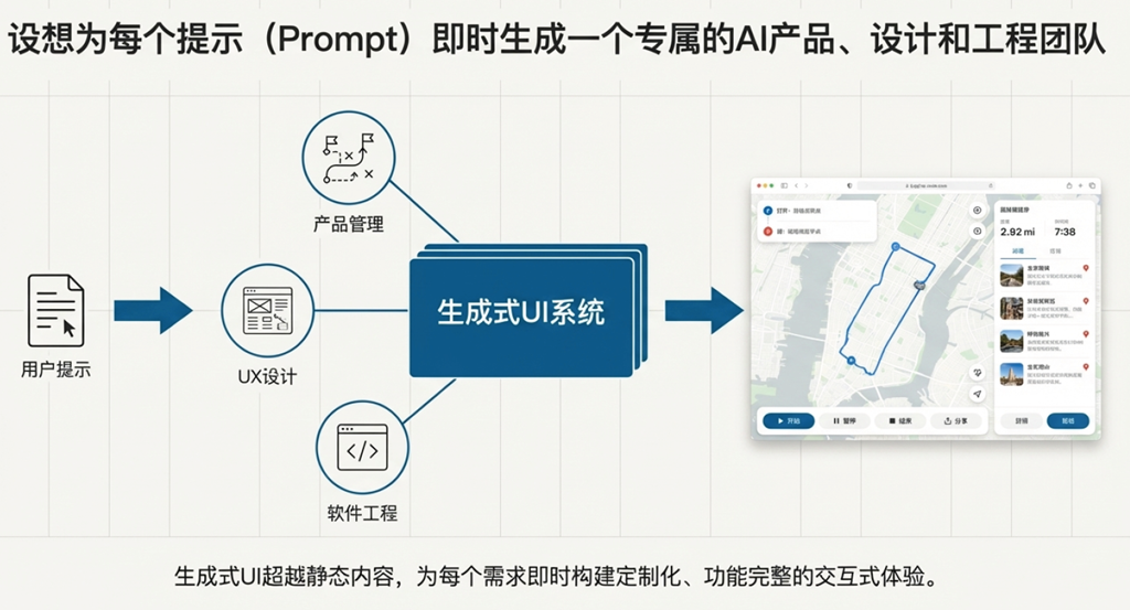 为了更形象地阐释这一愿景,我们引入一个核心比喻:“为每个提示词即时组建一支AI团队”(An instant AI team for each prompt)。传统的优质应用需要产品经理、用户体验设计师和软件工程师组成的团队历经数周甚至数月才能打造完成。而生成式UI则能在短短一两分钟内,为任意一个特定的提示词,即时“组建”一支具备同等能力的AI团队,从而生成一个量身定制的、无需编码的交互式体验。