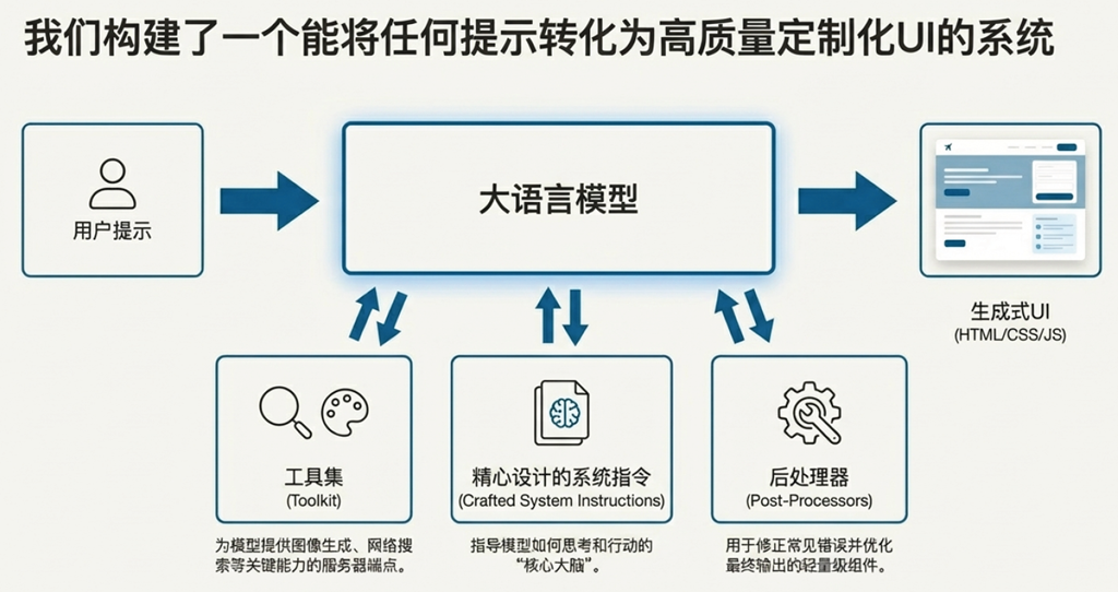要实现从一个简单的用户提示词到功能完备的交互式页面的转化,需要一个稳健且设计精巧的底层技术架构。本章将揭示支撑生成式UI系统运行的核心组件及其协同工作机制。