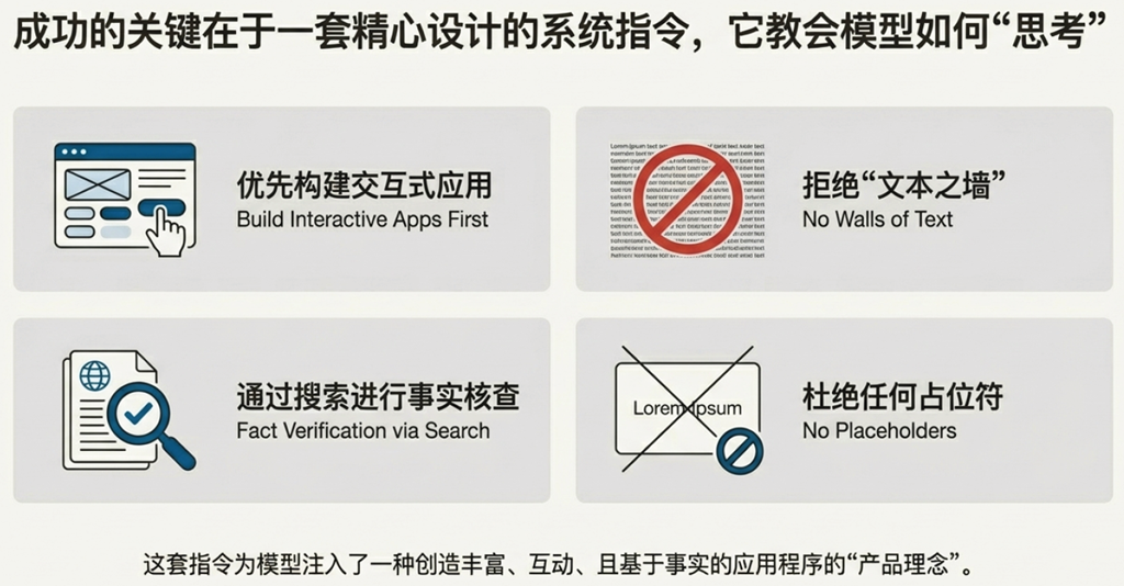在整个架构中,系统指令的重要性不言而喻。它相当于为AI模型设定了一套严格的“世界观”和“行为准则”。我们总结并强制模型遵循以下几条核心理念(Core Philosophy):