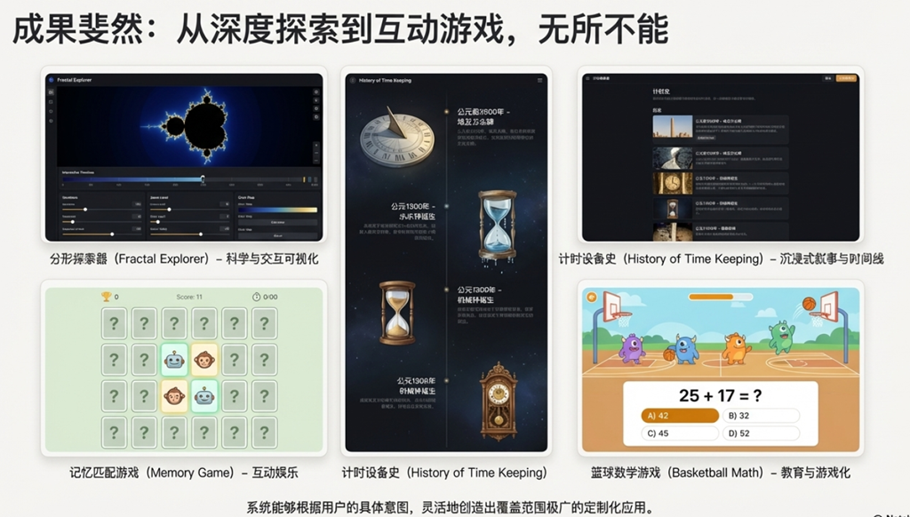 • 优先构建交互式应用 (Build Interactive Apps First): 即使面对一个可以用简单文本回答的查询(如“现在几点了?”),系统也应优先创造一个动态应用(如一个实时运行的时钟),而非返回静态文字。