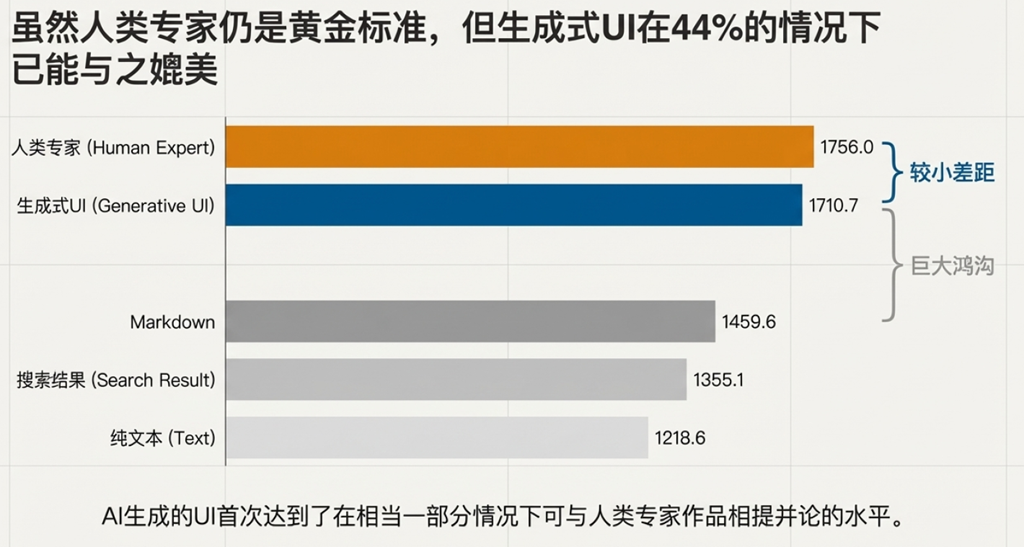 一个新范式的提出,必须伴随着严谨的性能评估。本章将通过量化的用户偏好数据,客观衡量生成式UI相较于现有主流界面形态的优势,并将其与代表最高标准的“人类专家”作品进行横向对比。