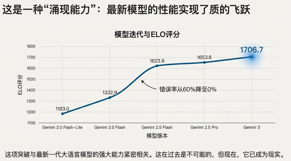 生成式UI的稳健实现,并非源于某项单一的技术优化或算法突破,而是更深层次现象的体现。本章的核心论点是:高质量的UI生成能力,是一种随着底层大语言模型能力实现跨越式发展而自然产生的“涌现能力”(Emergent Capability)。