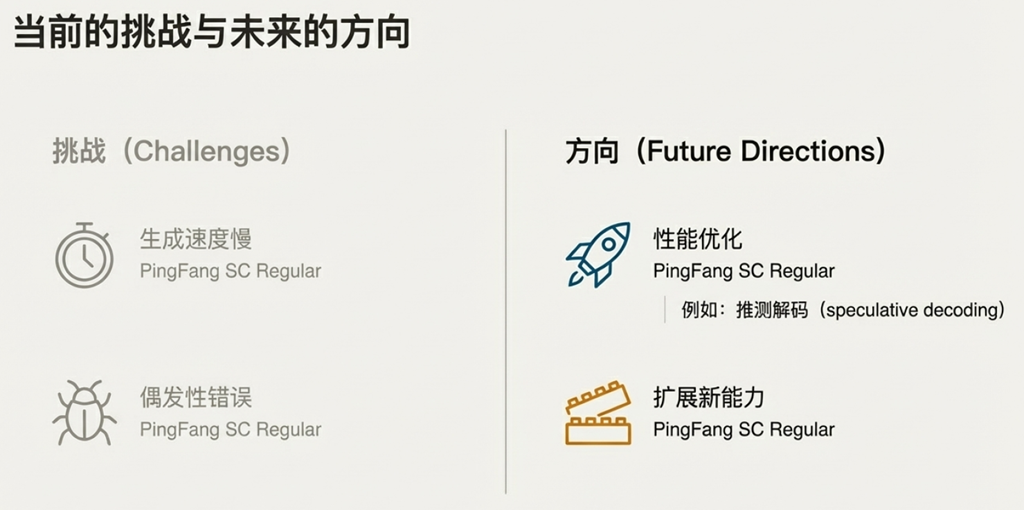 针对上述局限性,未来的研究可以从多个方向寻求突破。例如,在提升生成速度方面,进一步优化诸如“推测解码”(speculative decoding)等先进的推理加速技术,有望在不牺牲质量的前提下,显著缩短模型的响应时间。