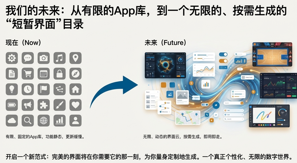 生成式UI的出现,预示着从“选择应用”到“生成应用”的转变。它有望从根本上改变用户与数字世界的互动方式,为每一个独特的需求、每一个稍纵即逝的想法,都创造一个专属的、功能完备的数字工具。