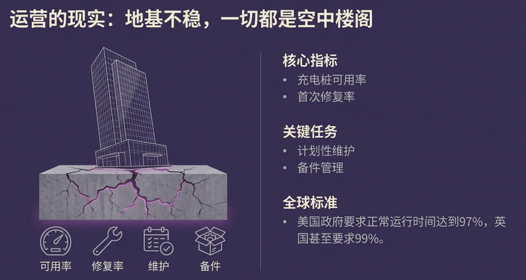 当前充电基础设施普遍面临低可靠性的严峻问题。哈佛商学院的一项研究指出,公共充电桩的可靠率仅为78%,这意味着用户有相当大的概率遭遇“找到但不能用”的窘境,这严重损害了消费者信心。与此形成鲜明对比的是,与国际趋势一致,中国等国政府也对“充电桩可用率(Uptime)”这一核心关键绩效指标(KPI, Key Performance Indicator)提出了极高的要求,部分国家的目标甚至高达99%。