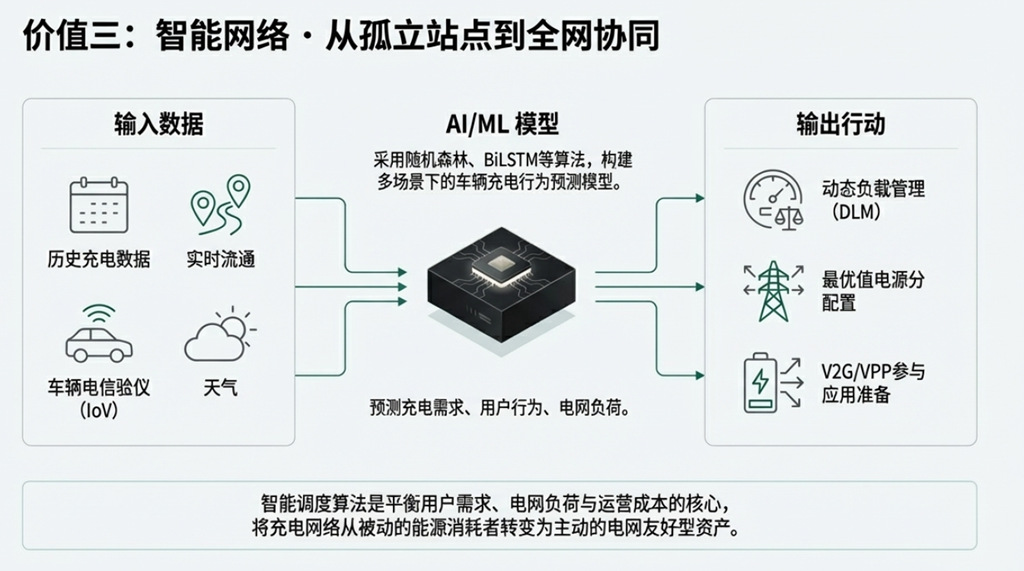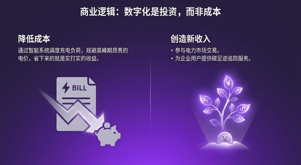 数字化工具正赋能充电运营商从单纯的电力消费者,转型为能够提供增值服务的能源即服务提供商(e-MSP, energy-as-a-Service Provider)。通过部署“动态负荷管理(DLM, Dynamic Load Management)”和“智能充电调度”系统,运营商可以在不超出电网容量限制的前提下,动态分配电力,并利用实时电价信号优化用电成本。更进一步,通过整合车辆到电网(V2G, Vehicle-to-Grid)技术,运营商可以组织电动汽车车队参与电力辅助服务市场和碳市场,将充电网络从电网的负荷转变为能够支持电网稳定性的“虚拟电厂”(VPP, Virtual Power Plant),这不仅开辟了全新的营收增长曲线,也使企业在能源转型中扮演了更积极的角色。