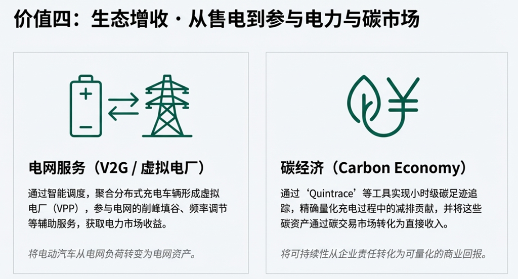 3. 深化生态系统合作,挖掘V2G与碳交易价值 敦促企业超越传统充电服务商的角色定位,主动转型为能源生态的积极参与者。应积极与电网公司、汽车制造商、能源聚合商及技术伙伴建立深度合作关系,共同开发车辆到电网(V2G)的商业模式和小时级碳核算能力。这不仅能开辟新的收入来源,还能将企业的可持续发展目标转化为切实的商业回报。