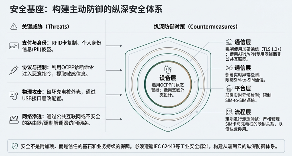 ◦ 对策: 定期对充电桩固件进行专业的“渗透测试”,以发现并修复漏洞。确保后端充电站管理系统(CPMS, Charging Point Management System)具备监控和阻止异常命令的安全框架。