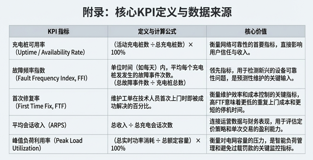 ◦ 充电桩可用率(Uptime)是核心用户体验指标,行业目标设定在97%至99%之间(来源:Techniche)。