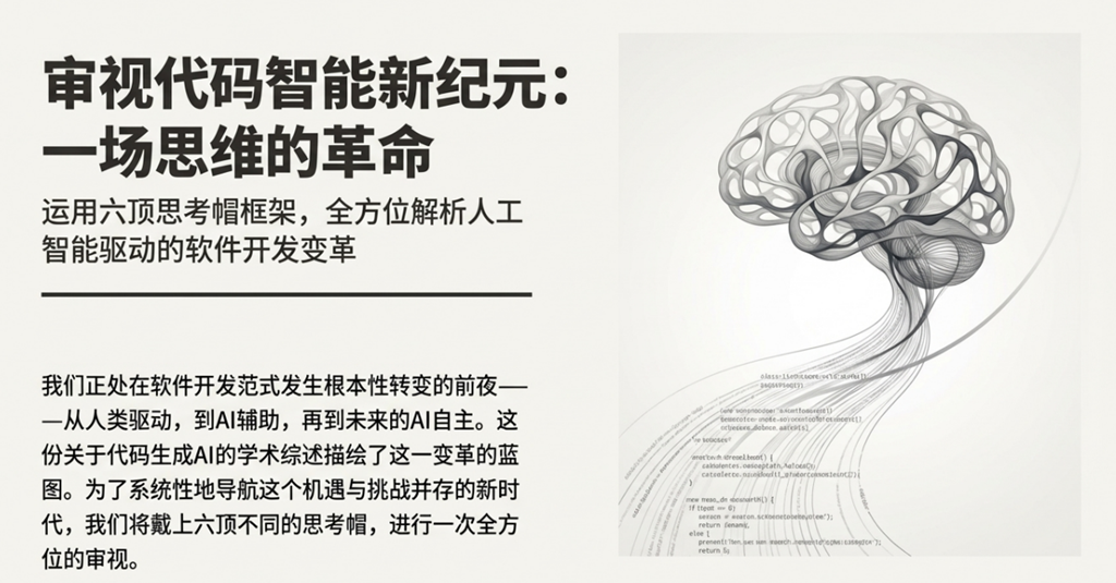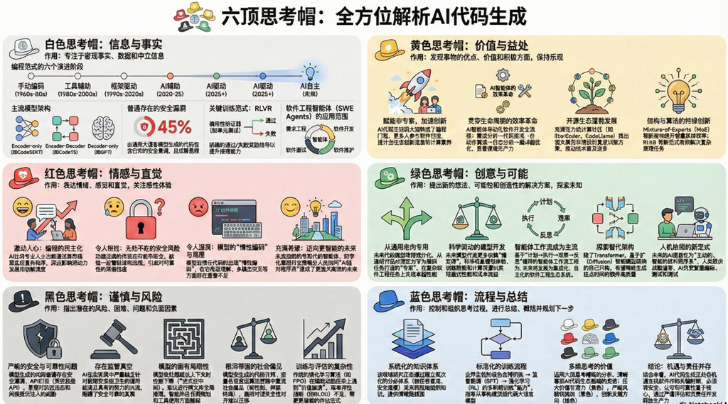 借鉴权威技术综述(arxiv.org/pdf/2511.18538)中的深度洞察,并创新性地运用爱德华·德·博诺的“六顶思考帽”分析框架。我们将从信息、价值、风险、情感、创新和规划这六个截然不同的维度,对AI代码生成技术的现状、挑战与未来进行一次系统性、多视角的战略剖析,以期为身处这场技术变革中的专业人士提供一幅清晰的全景图。