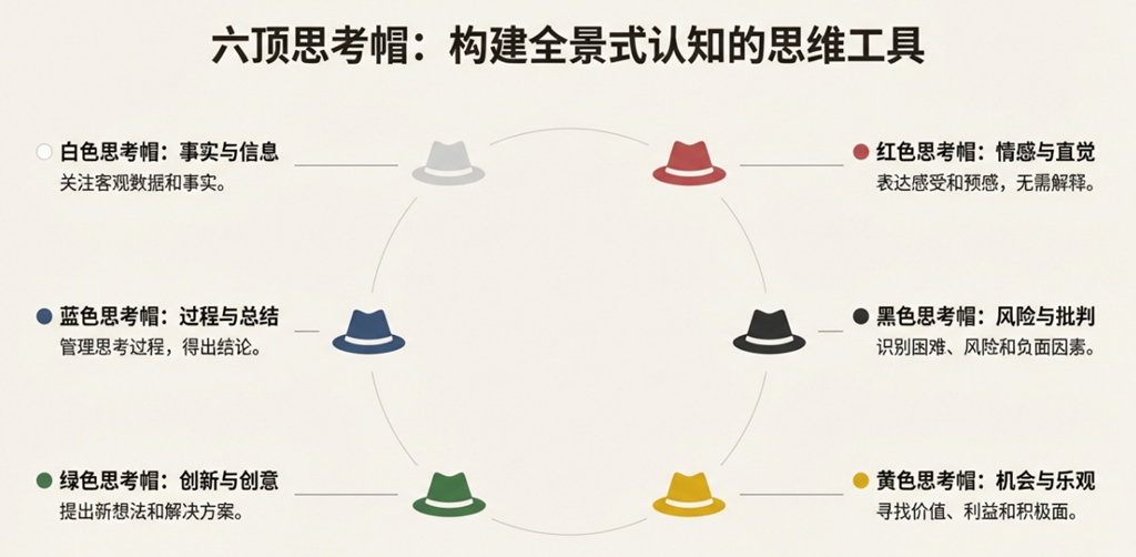 黑色思考帽是“警示帽”,代表谨慎和批判性思维。它让我们关注潜在的风险、困难、弱点和可能出现的负面结果,帮助我们提前规避问题。