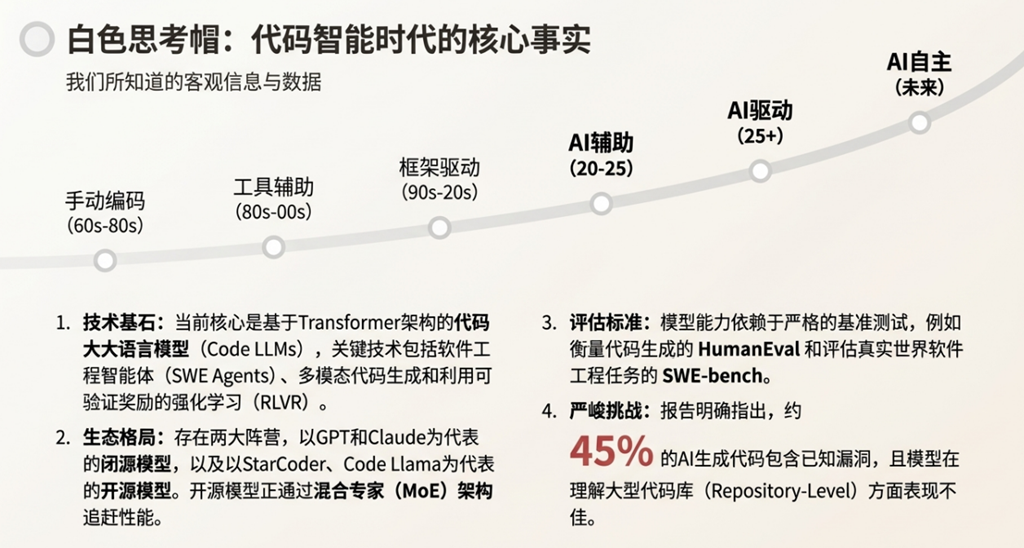 在进行任何战略分析之前,我们必须首先建立一个坚实的、基于事实的共同认知。白色思考帽在分析框架中扮演的正是这一角色,它要求我们聚焦于客观、中立地呈现数据和事实,排除一切主观臆断和情绪干扰。本节将严格依据源文档中的信息,系统性地梳理AI代码生成领域的关键事实、发展阶段和核心技术组成,为后续的多维度深度分析提供一个不可动摇的基础。