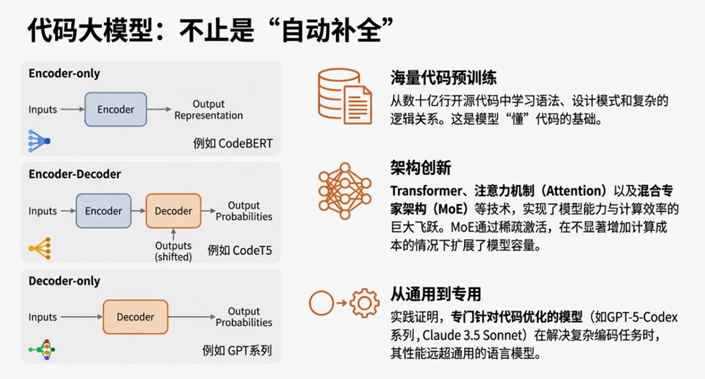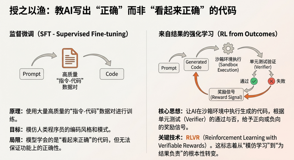 4. 强化学习 (Reinforcement Learning): 通过人类偏好数据(RLHF)或可验证的奖励信号(RLVR),例如代码编译成功和单元测试通过率,进一步对齐模型,使其生成更可靠、更安全、更符合预期的代码。