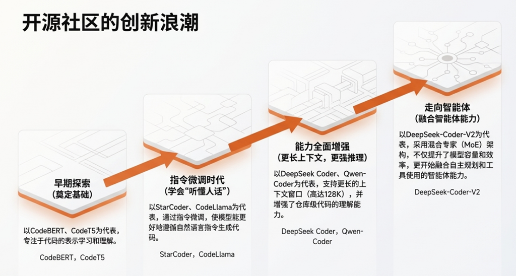 • 超越Transformer的未来架构 为解决长上下文理解的性能瓶颈以及MoE等架构的训练复杂性,未来的模型可能不再是单一的Transformer结构。源文档中对扩散模型(Diffusion-based models, 2.2.3节)和混合架构(Hybrid Architectures, 2.1.2节)的提及,启发我们展望未来的模型架构。未来的代码模型可能是融合了循环网络、状态空间模型、图神经网络和扩散模型等多种架构优点的“混合体”,以便在长上下文处理能力、计算效率和特定任务性能之间达到当前架构无法企及的更优平衡。