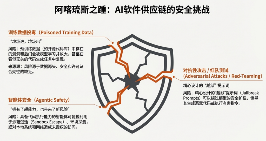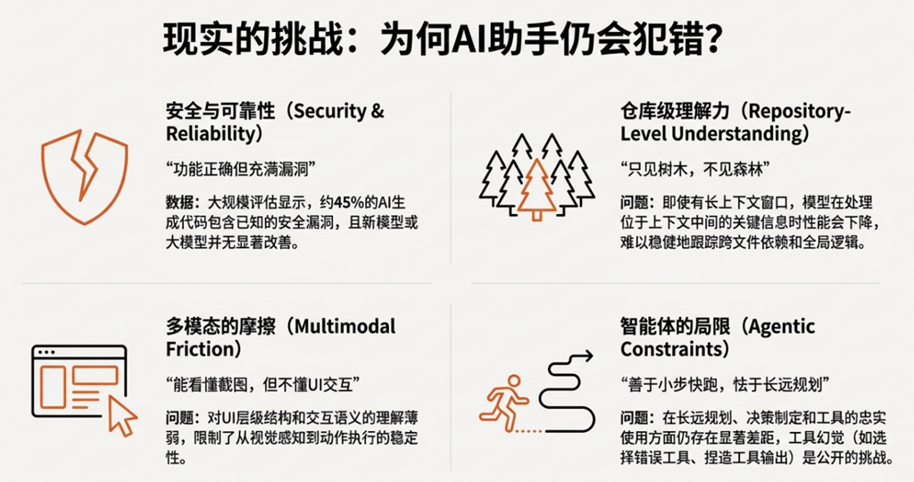 • 安全与可靠性: 大规模评估显示,约有45%的AI生成代码包含已知的安全漏洞,并且模型规模的增大并未显著改善这一问题。