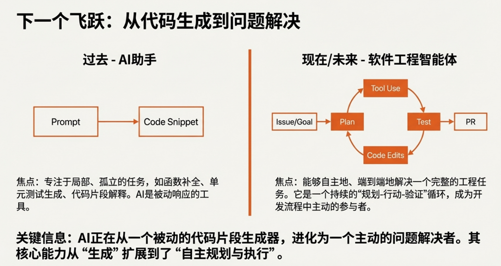 • 实现端到端的软件工程自动化 软件工程智能体(SWE Agents)的出现标志着一个重要的战略转折点。它们不再仅仅是辅助工具,而是致力于覆盖从需求工程(5.1.1节)、软件开发(5.1.2节)、软件测试(5.1.3节)到软件维护(5.1.4节)的整个软件生命周期。如ChatDev和MetaGPT等端到端框架的探索,预示着软件开发正从“AI辅助编程”迈向“AI自主软件开发”的全新范式,这有望实现软件生产力的数量级提升。