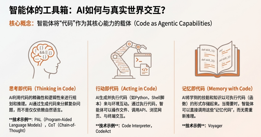 • 赋能通用智能体 代码作为一种精确、无歧义的形式化语言,其潜力已超越软件工程本身,成为构建通用智能体(Generalist Agents)的通用媒介(第6章)。“代码即智能体能力”(6.2节)和“代码即环境接口”(6.3节)等概念,使得AI智能体能够用代码进行思考(Thinking in Code)和行动(Acting in Code)。无论是控制机器人,还是操作电脑图形界面和终端,代码都提供了一个统一的接口,为实现更广泛的“数字世界具身智能”(4.4.6节)奠定了坚实的基础。