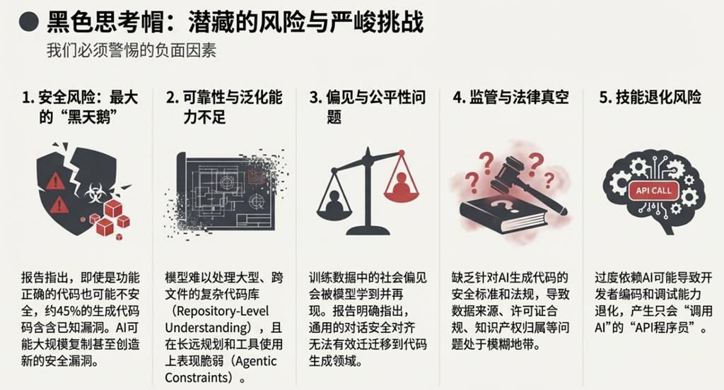 黑色思考帽代表着谨慎、批判和风险评估。在技术高速发展的浪潮中,它的战略意义尤为重要,能够帮助我们识别潜在的缺陷、障碍和负面后果,从而确保技术发展路径的稳健与安全。本节将依据源文档,系统性地揭示AI代码生成技术在走向成熟应用过程中所面临的严峻挑战和固有风险。