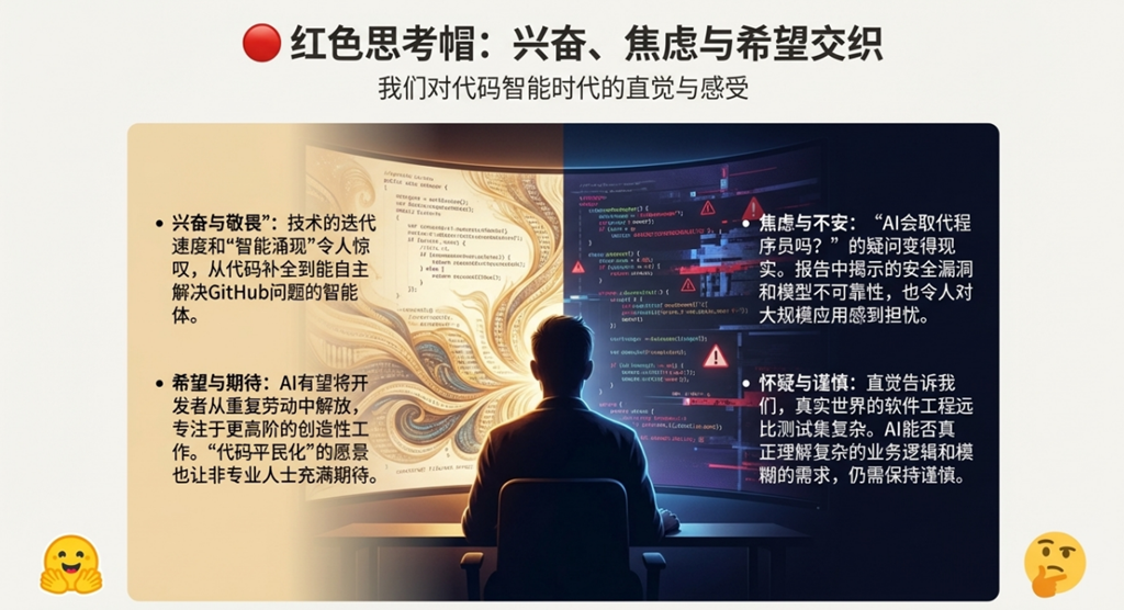 这些根植于技术内核的风险和挑战,构成了AI代码生成技术从“可用”走向“可靠”和“可信”所必须跨越的障碍。在权衡了事实、机遇和风险之后,我们需要用红色思考帽来体察这项技术在人类情感和直觉层面所带来的复杂影响。