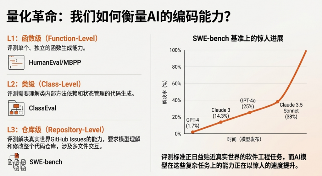 • 评估与基准的复杂性 如何准确评估AI代码生成的能力是一个巨大的挑战。传统的评估范式,例如衡量n-gram重叠度的BLEU指标,已无法胜任。为此,该领域正在转向更复杂的评估范式,例如通过评估功能正确性的基于执行的指标(如在HumanEval基准上的pass@k得分),甚至是需要搭建复杂仓库环境的智能体基准测试(如SWE-bench)(第3章)。评估方法本身的复杂化,恰恰说明了准确评估这项技术的难度之大。