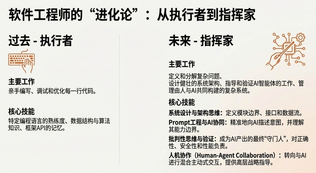 • 开发者的焦虑与不安 源文档中关于构建“值得信赖的AI结对程序员”的讨论,其背后也反映了开发者群体的复杂情绪。这种焦虑正是推动研究领域探索人机协同合作(Synergistic Human-Agent Collaboration,5.4节)的人性现实。一方面,我们为即将获得一个无所不知、不知疲倦的编程伙伴而感到激动;但另一方面,一种深切的焦虑也随之而来——我的角色会被替代吗?我的技能会过时吗?我们对“与AI协作”的未来抱有希望,但对“被AI取代”的可能感到不安。