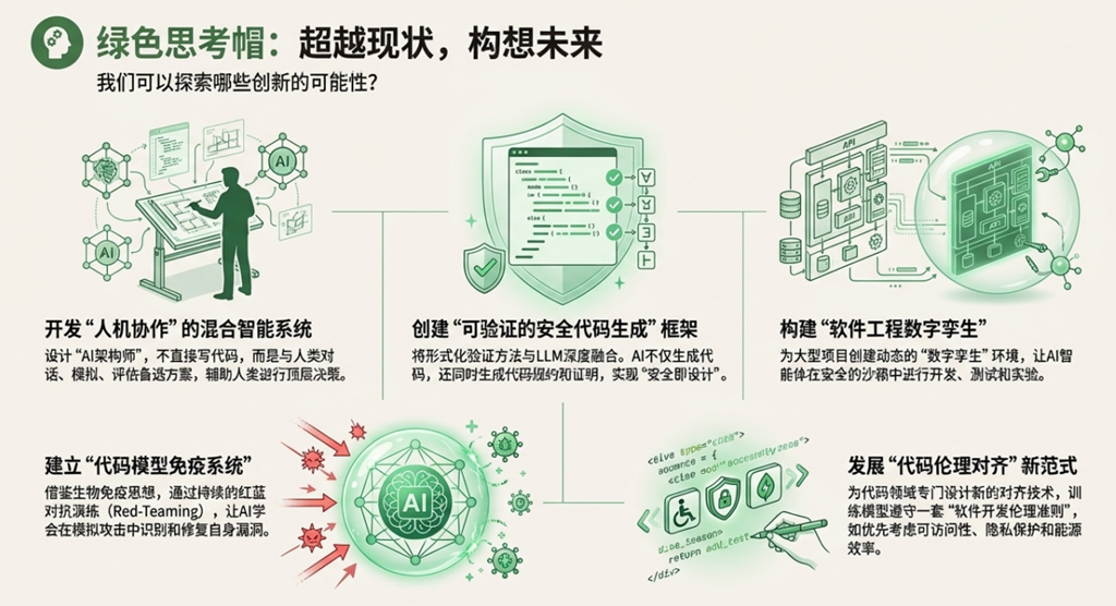 绿色思考帽代表着创造力、新想法和无限的可能性。它鼓励我们挣脱现有框架的束缚,进行自由的头脑风暴,探索解决问题的新途径和技术演进的新方向。本节将从源文档中提炼出最具前瞻性的趋势和创新的理念,为AI代码生成技术的未来演进描绘一幅激动人心的蓝图。
