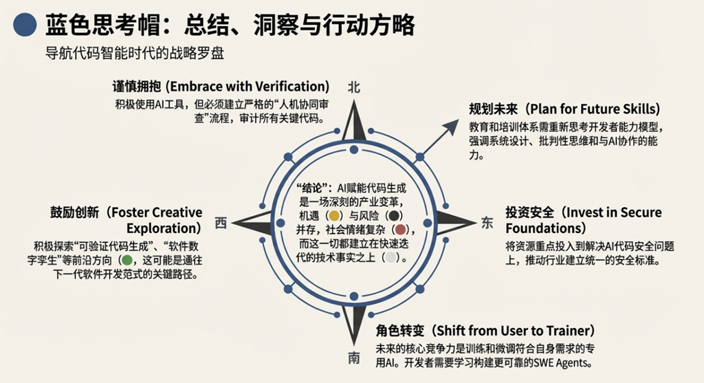 蓝色思考帽是思考过程的“指挥官”,它负责管理整个思考流程,进行总结、归纳并制定下一步的行动计划。在本分析的最后阶段,蓝色思考帽将整合前五顶帽子的所有观点——从客观事实到潜在价值,从严峻风险到创新机遇——提炼出关于AI代码生成领域的宏观战略结论,并为未来的发展勾勒出一条清晰、审慎且富有远见的路径。