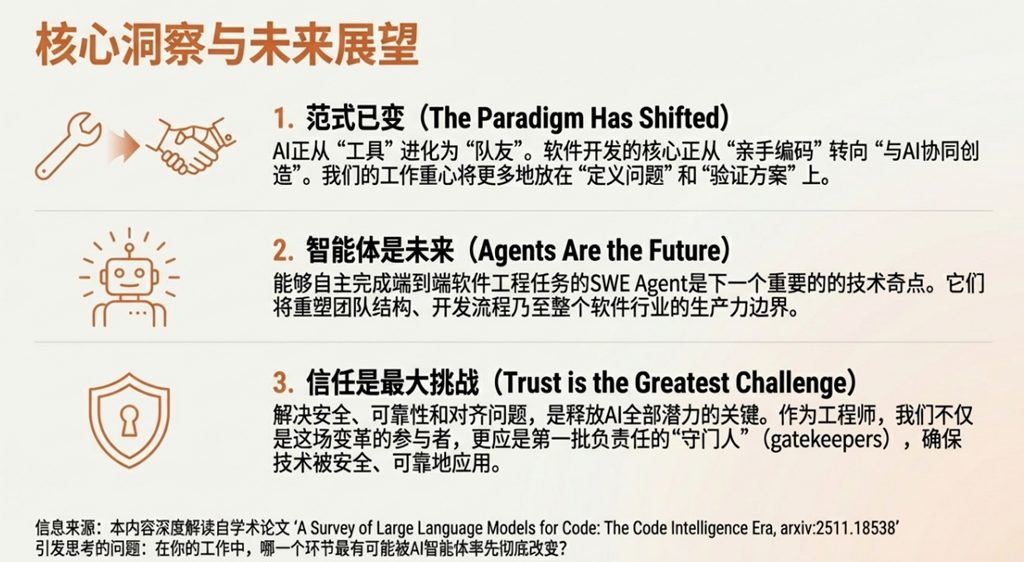 • 人机协同的新范式:可信赖的AI伙伴 根据5.4节的展望,未来的人机关系将不再是简单的“人-工具”关系。AI将进化为主动的、有洞察力的“结对程序员”甚至是“技术合伙人”。这标志着向“混合主动权交互模型”(mixed-initiative interaction models)的转变,即AI主动处理复杂任务,而人类提供战略指导,而非简单的命令-响应关系。像Aider和AutoDev这样的框架预示着一种高效的共生关系,将极大地释放人类的创造力。