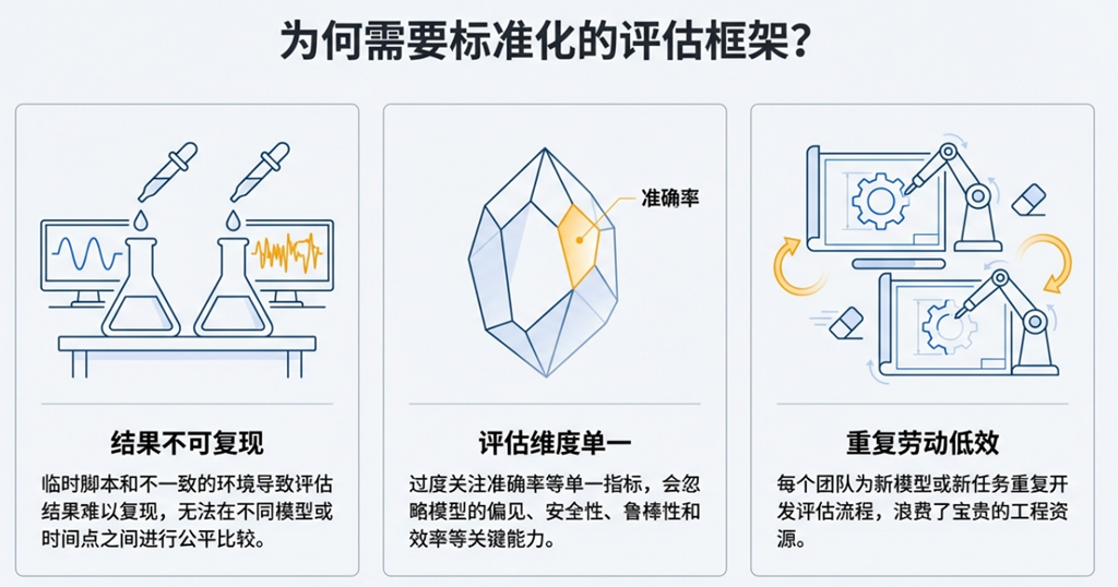 可复现性危机 (Reproducibility Crisis) 评估结果的复现是科学进步的基石。然而,在 AI 领域,由于评估环境的细微差异、数据预处理流程的不透明以及提示词工程(prompting)等实现细节的模糊,许多已发表的评估结果难以被第三方独立验证。这不仅损害了研究的可信度,也阻碍了社区在他人工作基础上进行迭代创新。